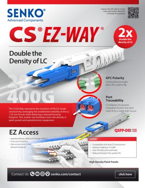 The CS EZ-Way is a Very Small Form Factor (VSFF) connector and is ideal for space-saving solutions. The CS EZ-Way connector allows you to double the density in patch panels compared to an LC duplex. The polarity switching features allows for quick reversal of the connector polarity without the need for connector re-termination. The unique push-pull boot allows for better usability in high-density applications. The connector accepts up to 2.0/3.0mm duplex fiber.